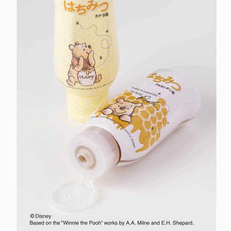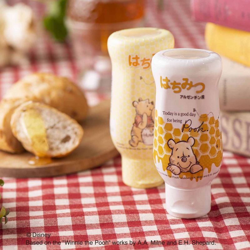白いキャンパスにくまのプーさんが可愛い、子供から大人まで愛されるデザインです。ヨーグルト、トーストにぴったりなはちみつ。 花々の豊かな香りをお楽しみください♪